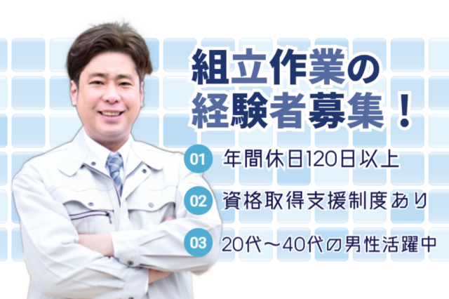 | 資格・経験 | ●学歴不問 ●経験年数や作業種類は不問 ●第二新卒・ブランク歓迎 【必須条件】 ・玉掛、床上操作式クレーンの資格 ・機械設備の組立経験 電動ドライバーやレンチ、スパナの使用経験、 ハンダ付け作業な... |