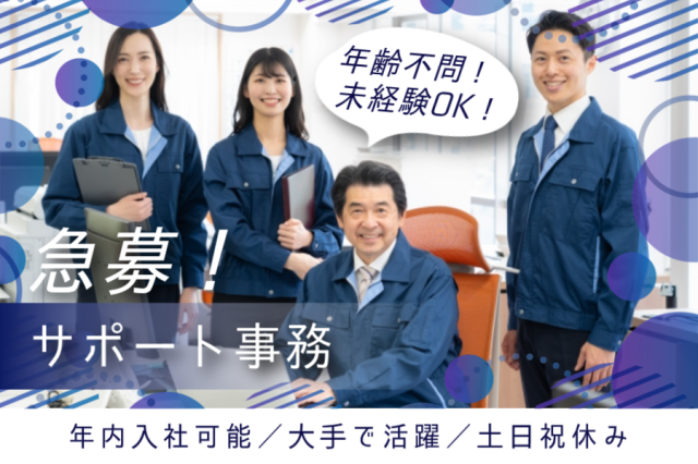 | 資格・経験 | / 未経験OK!事務デビュー歓迎! 学歴不問・第二新卒OK \ Excelの基本操作・入力できる方 であれば応募OKです♪ 事務や生産管理などの 経験がある方は優遇あり♪ (スキル不問・ブランクOK) |