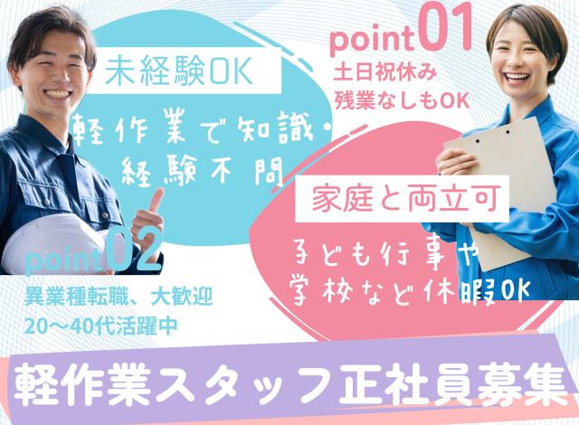 | 資格・経験 | ■応募条件なし/未経験歓迎求人♪ ■学歴不問/経験不問/資格不問 ■第二新卒・ブランクOK 入社後の研修が充実なのはもちろん、 すぐに慣れていただける軽作業が メインのため経験・知識問いません♪ こ... |